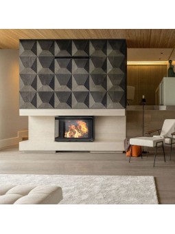 Vložka má singulární dekorativní sklo Díky tomu vypadá elegantně a moderně. Takové řešení vizuálně rozšiřuje přední část vložky a zdůrazňuje pohled na oheň.
